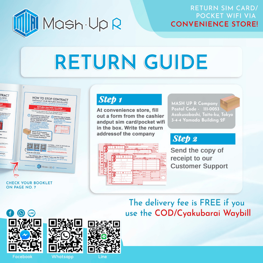 Step 1: At convenience store, fill out a form from the cashier and put sim card/pocket wifi and smart pit card in the box. Write the return address of our company: