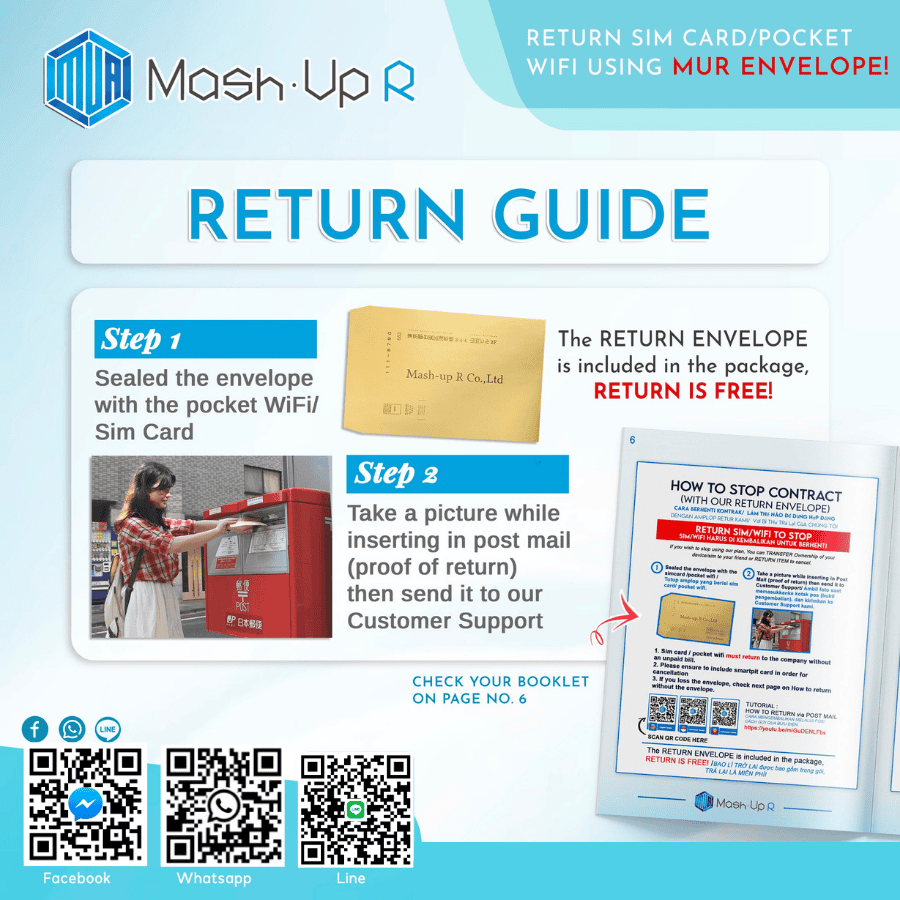 Step 1: Input sim card/ pocket wifi and smart pit card in the return envelope which is included in the order package. Then seal the envelope.